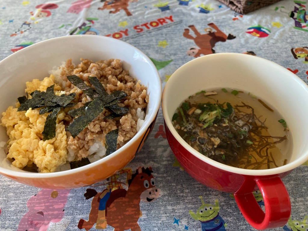 そぼろ丼🍚、スープです。