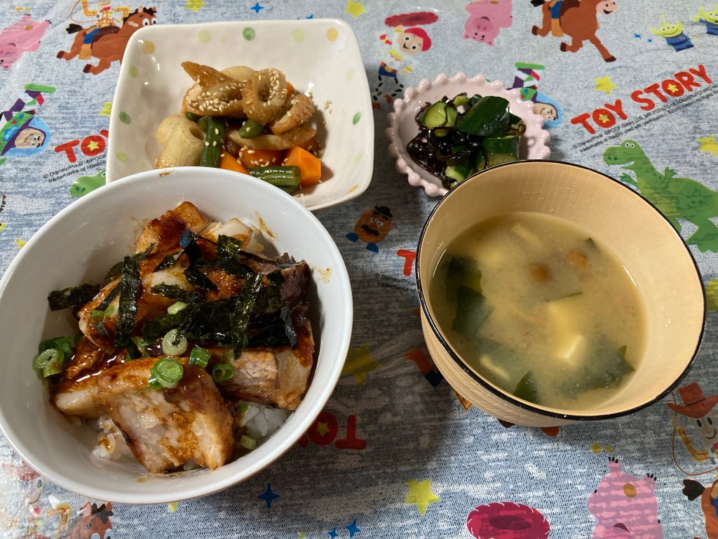 チャーシュー丼、ちくわとにんじん🥕の煮物、