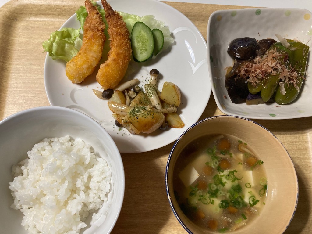 ごはん、エビフライ🍤、じゃがいもとしめじの