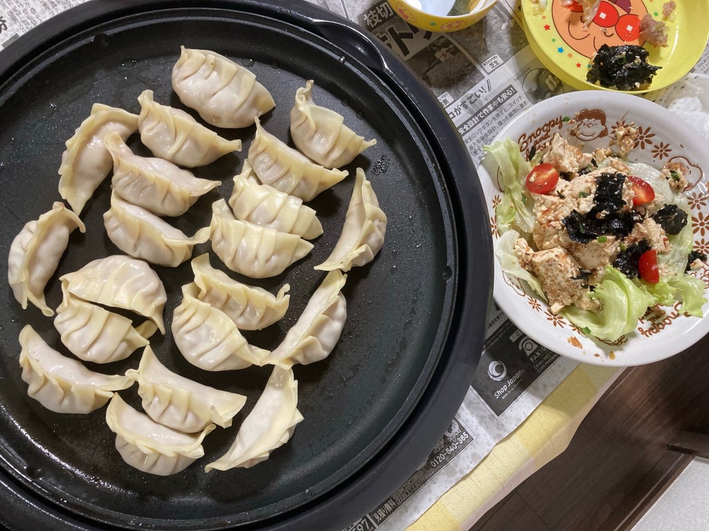 餃子、和風サラダ、ごはん、お味噌汁でした。